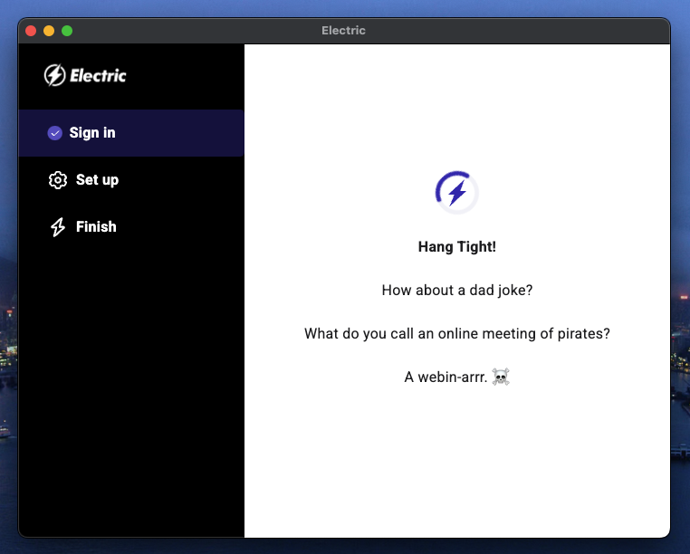 Electric for Desktop will show this installer loading when the set up is nearing completion: