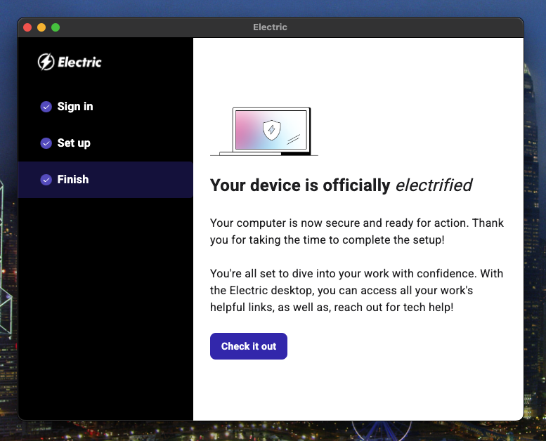 Electric for Desktop is completed with the install process when you see this screen. Click “Check it out” to open the app!